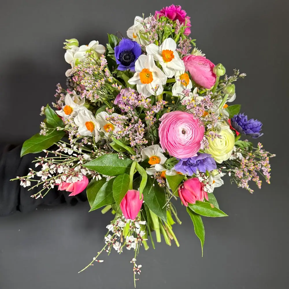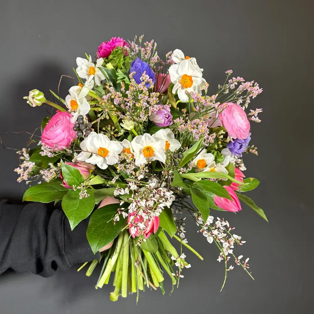 Je nach Saison kommen unterschiedliche Frühlingsblumen zum Einsatz, wodurch jeder Strauß seinen eigenen Charakter erhält. Ein vielseitiger Begleiter für viele Anlässe – oder einfach, um den Frühling ins Haus zu holen.