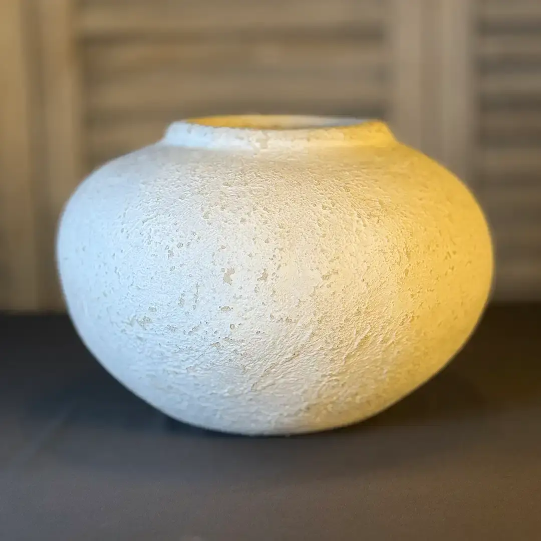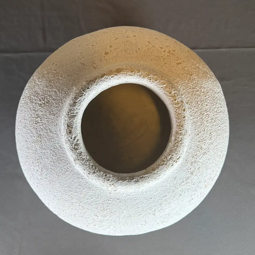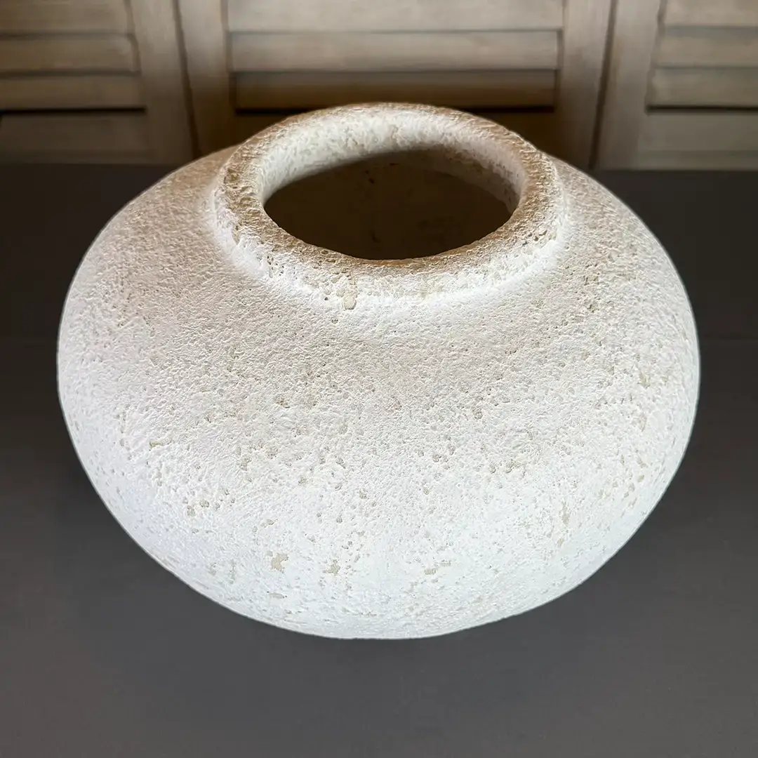 Diese Vase lebt von ihrer weichen, flachen Form und der leicht unregelmäßigen, strukturierten Oberfläche, die an natürlichen Stein erinnert.