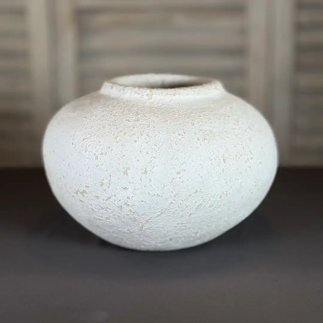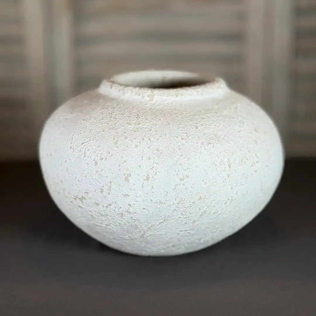 Die breite, flache Form eignet sich ideal für lockere, niedrige Arrangements, Trockenblumen oder einzelne Blüten mit kurzen Stielen. Gleichzeitig wirkt sie auch ganz pur als ruhiges Designobjekt. Die strukturierte Oberfläche sorgt für Tiefe, ohne aufdringlich zu sein.